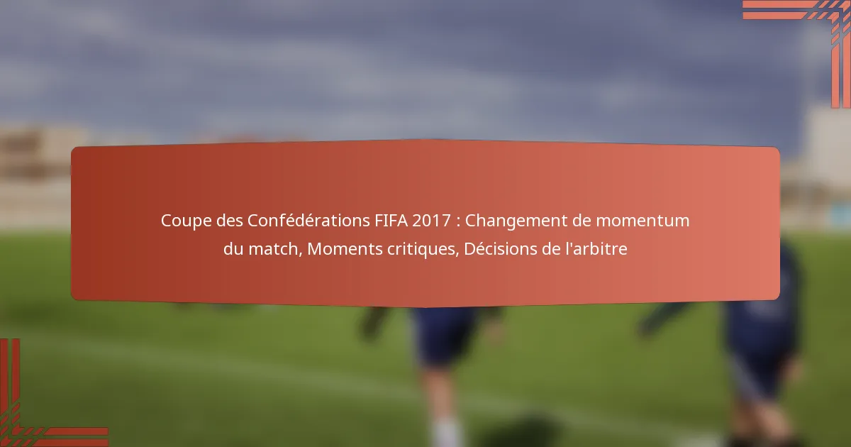 Les principaux changements de momentum lors de la Coupe des Confédérations de la FIFA 2017 ont significativement influencé les résultats des matchs, modifiant souvent la trajectoire des jeux. Ces changements étaient caractérisés par des moments critiques tels que des actions de but, des ajustements tactiques et des blessures de joueurs, qui ont tous joué des rôles déterminants dans la performance des équipes.