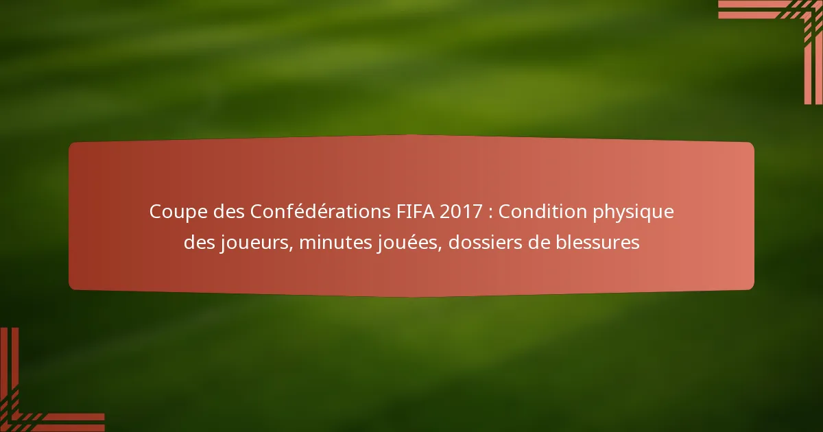 La Coupe des Confédérations FIFA 2017 a mis en évidence l’importance cruciale de la condition physique des joueurs, car elle affecte directement la performance et le risque de blessure. Les joueurs clés qui ont passé un temps significatif sur le terrain ont été essentiels aux stratégies de leurs équipes, tandis que les blessures ont posé des défis qui ont influencé la profondeur et l’efficacité globales de l’effectif tout au long du tournoi.